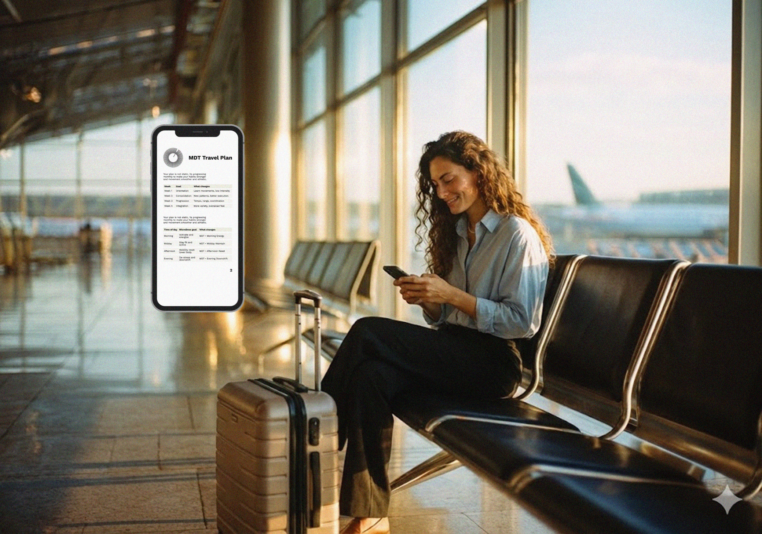 • After you complete a short setup quiz, the system selects the most relevant version of the 30-day MDT framework based on your travel style, available space or equipment, and movement preferences. You then receive a structured PDF plan designed for practical use.