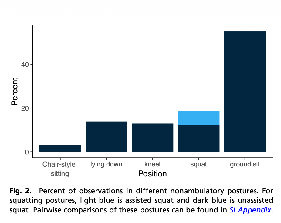 In our modern world, we rest by completely disengaging our bodies. We sink into ergonomic office chairs and plush couches that fully support our weight, reducing muscular effort to very low levels. But hunter-gatherers do not have chairs. When they rest, they often adopt what researchers describe as “active rest” postures. Observational data shows that the Hadza spend roughly 18% of their resting time squatting and another 12.5% kneeling.