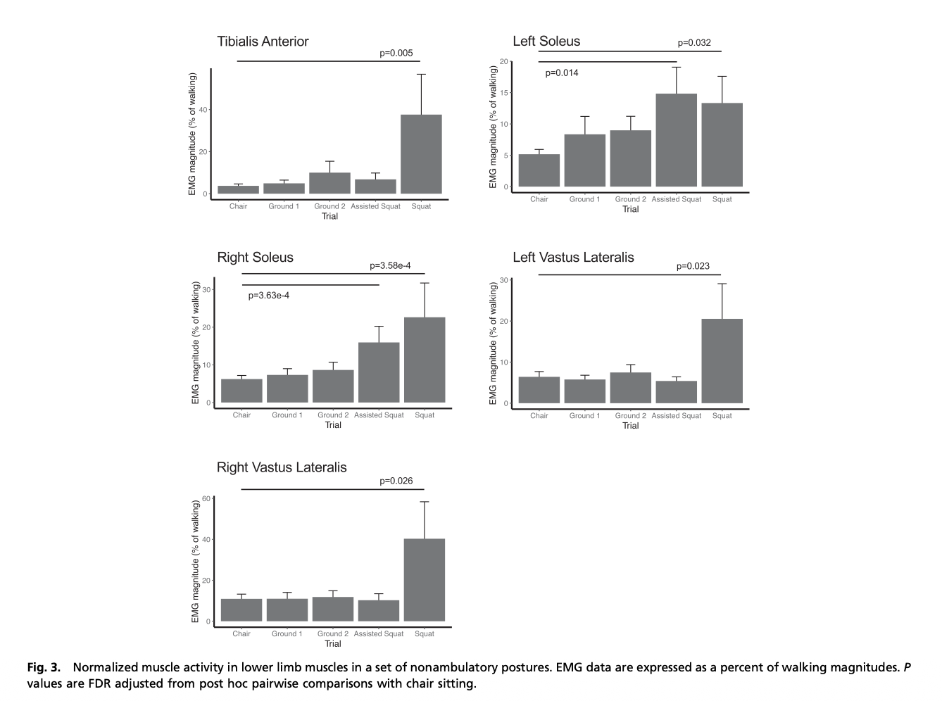 When researchers tested these specific postures using electromyography (EMG) to measure muscle contractions, the physiological difference was significant. Squatting requires substantially higher lower-limb muscle activity, reaching approximately 20–40% of the activation observed during walking. Chair-sitting, by contrast, requires minimal lower-body muscle activity.
